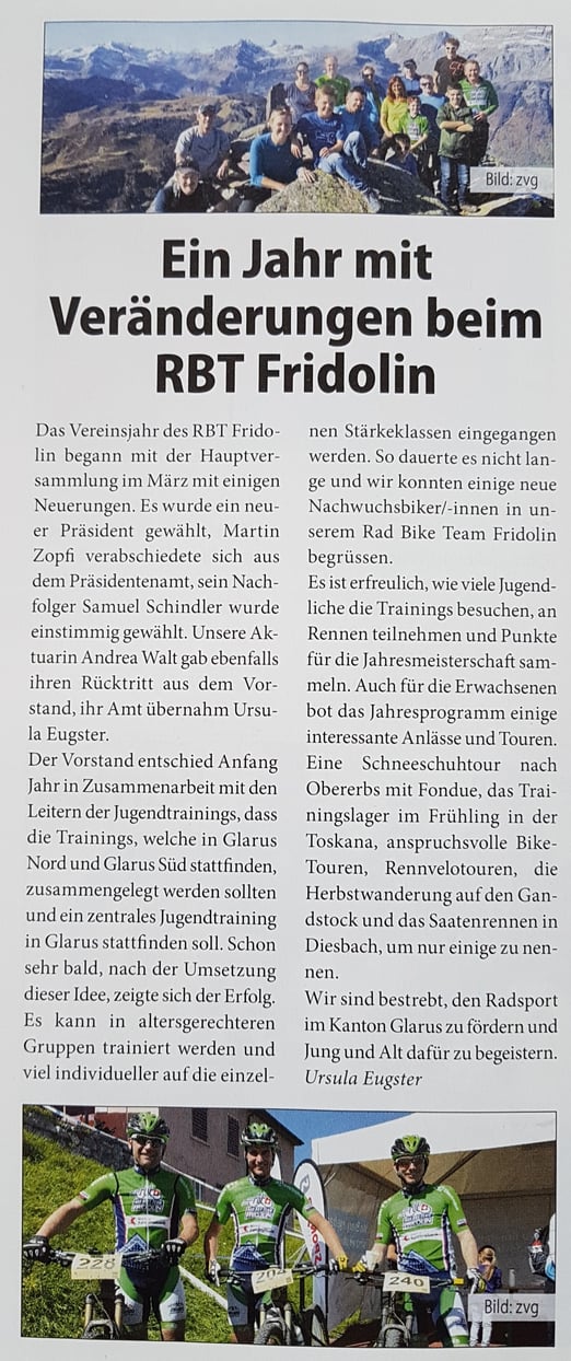Der Vorstand entschied anfangletztes Jahr in Zusammenarbeit mit den Leitern der Jugendtrainings, dass die Trainings welche in Glarus Nord und Glarus Süd stattfinden zusammengelegt werden sollten und ein Zentrales Jugendtraining in Glarus stattfinden soll. Schon sehr bald, nach der Umsetzung dieser Idee, zeigte sich der Erfolg. Es kann in altersgerechteren Gruppen trainiert werden und viel individueller auf die einzelnen Stärkeklassen eingegangen werden. So dauerte es nicht lange und wir konnten einige neue Nachwuchsbiker/innen in unserem Rad Bike Team Fridolin begrüssen.